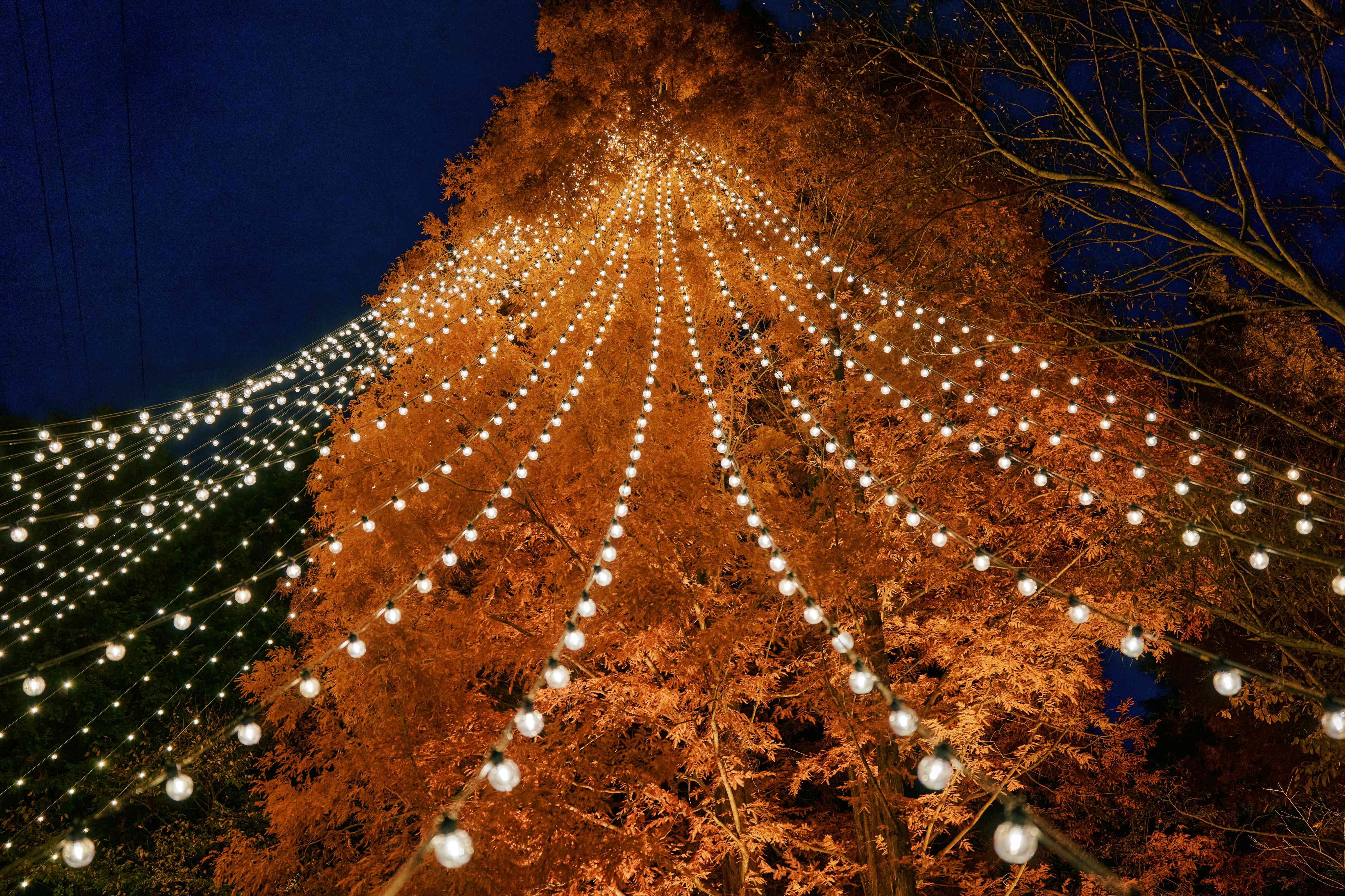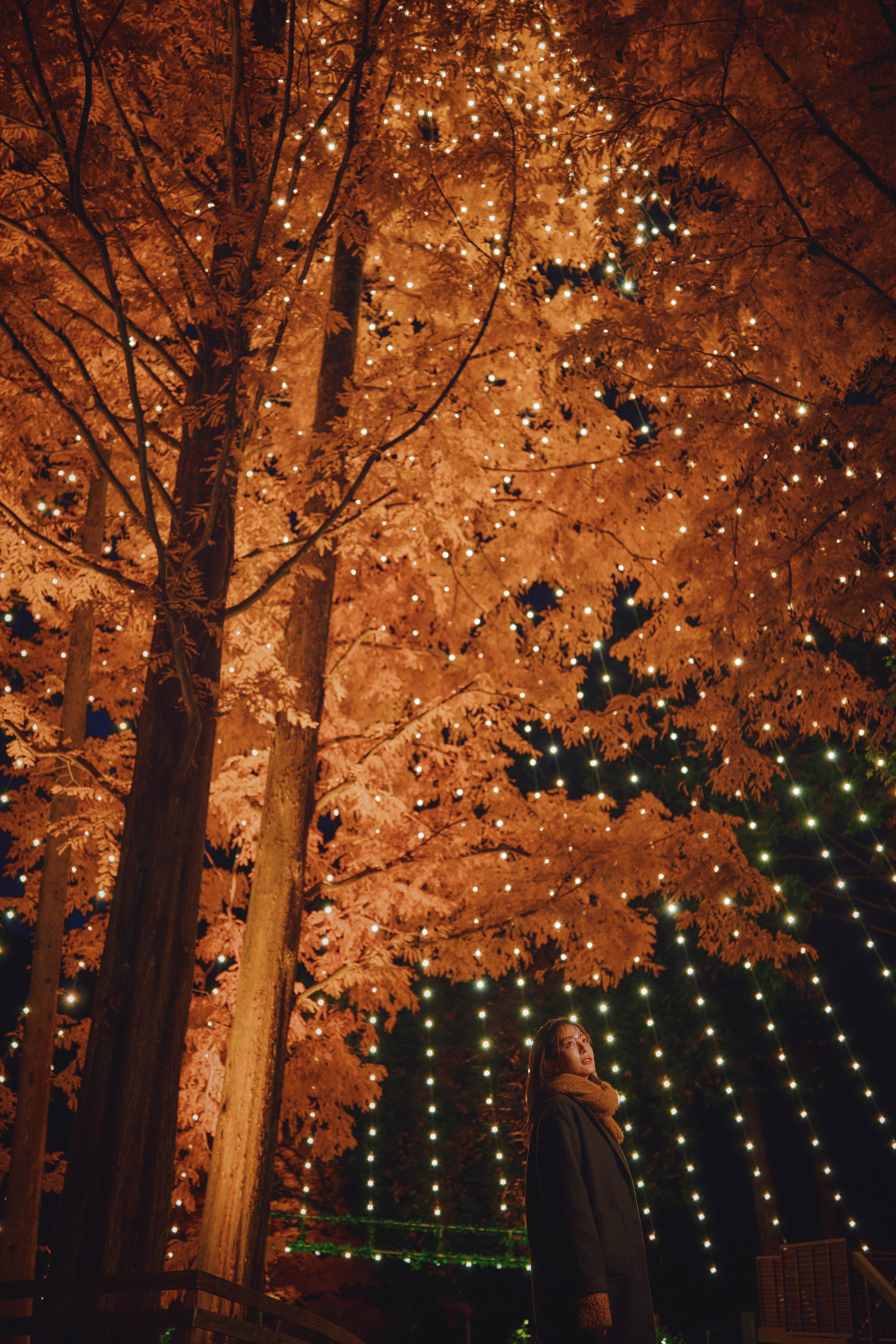 ①ツリーの真下は煌めくメタセコイアの葉の織りなす幻想的な空間