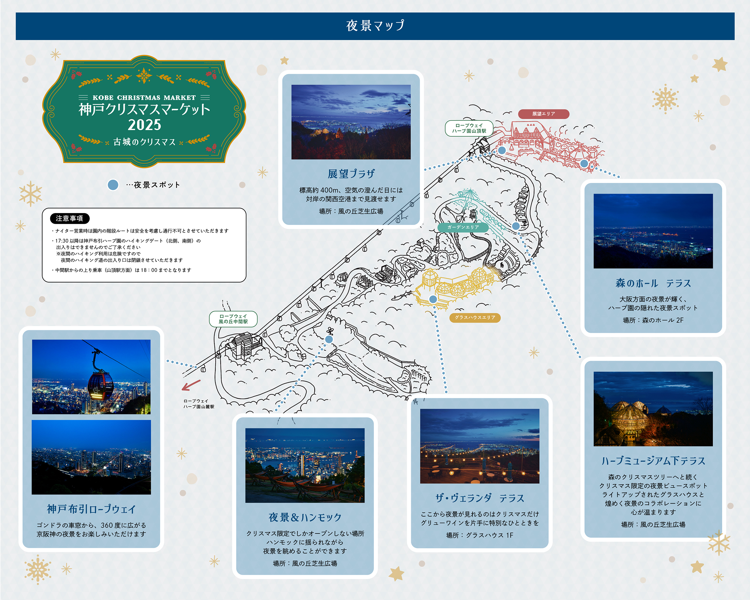 トピックス HOME トピックス一覧トピックス詳細 夜景スポット 掲載日:2025/08/30 ** WEBチケットがおすすめ ** チケット購入フロア(ロープウェイ山麓駅4F)でスムーズにご案内できます ※1Fの乗車列にはお並びいただく必要がございますのでご了承ください 夜景スポットロープウェイの車窓や標高約400mの山上、その他クリスマスだけの夜景スポットと合わせてご紹介します★神戸布引ロープウェイ★展望プラザ★森のホール2F★ハーブミュージアム下テラス★ザ・ヴェランダ神戸 1Fテラス★風の丘芝生広場「神戸クリスマスマーケット2024 -古城のクリスマス-」リーフレットのデジタルブックはこちら ※写真はイメージです※内容は変更となる場合がございます