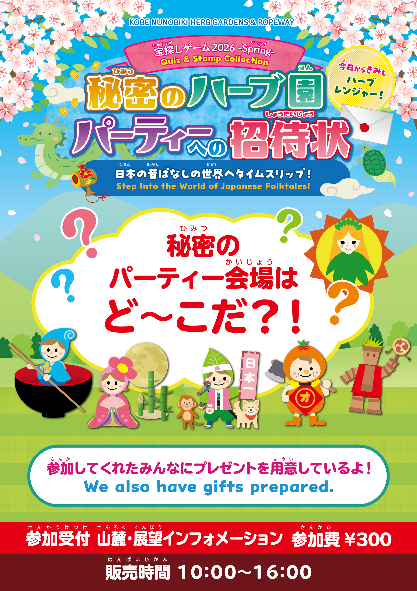 トピックス HOME トピックス一覧トピックス詳細 宝探しゲーム2026 -Spring- 今日からきみもハーブレンジャー! ‐ 秘密のハーブ園パーティーへの招待状‐ 掲載日:2026/03/02 お子様にも大人にも大人気!「宝探しゲーム2026 -Spring-」今日からきみもハーブレンジャー! ‐ 秘密のハーブ園パーティーへの招待状‐ 期間:3/14(土)~7/5(日)販売時間:10:00~16:00 参加受付:山麓・展望インフォメーション 料金:300円 ※スタンプラリー付き 舞台は、神戸布引ハーブ園。秘密のハーブ園パーティーに招待されたあなたは、ハーブの女神さまがいるパーティー会場(秘密のお庭)を探しに出かけますまずは、その場所を知る4人のハーブレンジャーを見つけなければいけませんマップやヒントを元に無事全員に出会うことができると…そこでは、ハーブの女神さまが「ひみつのあいことば」とプレゼントを用意して待っています色々な所で、植木鉢の妖精「ハービー」が、やさしくゲームのお手伝いしてくれるので安心ですみんなで4人のハーブレンジャーを見つけ出そう! WEBチケットがおすすめ チケット購入フロア(ロープウェイ山麓駅4F)でスムーズにご案内できます ※1Fの乗車列にはお並びいただく必要がございますのでご了承ください。 植木鉢の妖精「ハービー」 「GARDEN FEST 2026 -Spring- ハーブとともに優雅に過ごす」はこちら ※写真はイメージです※内容は変更となる場合がございます※表記金額は全て税込です